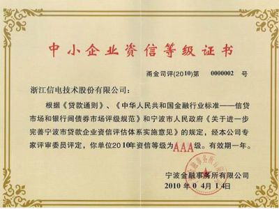 经专家评审委员评定,开云电竞获得了2010年度中小企业最高级别的资信等级——AAA级。 浙江信电首次参评中小企业资信等级,直接...