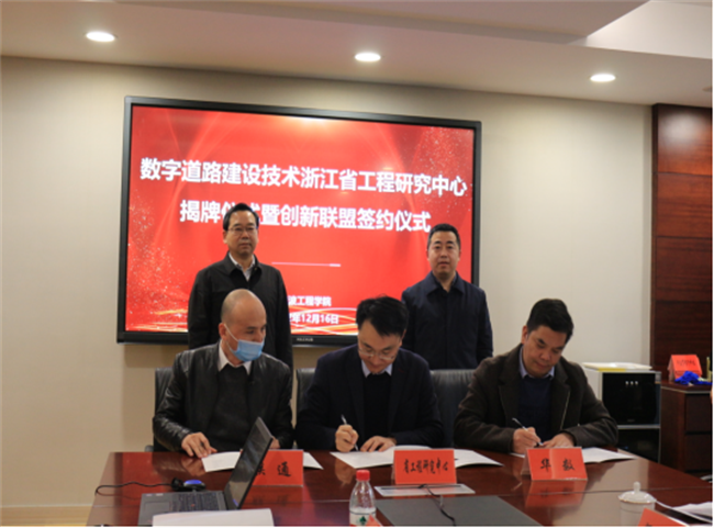 揭牌仪式当天,同步举行了创新联盟签约仪式。宁波工程学院建筑与交通工程学院院长、工程中心主任张水潮代表中心与宁波市交通发展研究中心、宁波市市政设施中心、宁波交通工程建设集团、宁波市政工程建设集团、宁波建工工程集团、宁波华数光电网络有限公司、中国联通宁波分公司、海康威视宁波分公司、阿波罗智行科技(宁波)有限公司九家创新联盟单位签署了创新联盟合作协议。